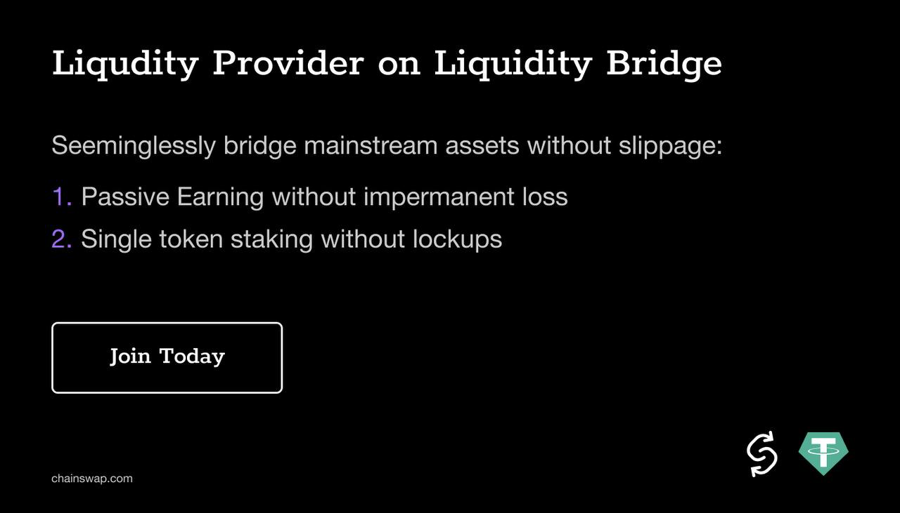 Users will be able to go to chainswap.exchange/liquidity and stake their USDT as a single side LP. To be a liquidity provider, you first need to decide which chain and token you want to provide liquidity for and then stake into the liquidity pool. LPs will be rewarded in form of TOKEN. Rewards are dynamic depending on price of TOKEN.