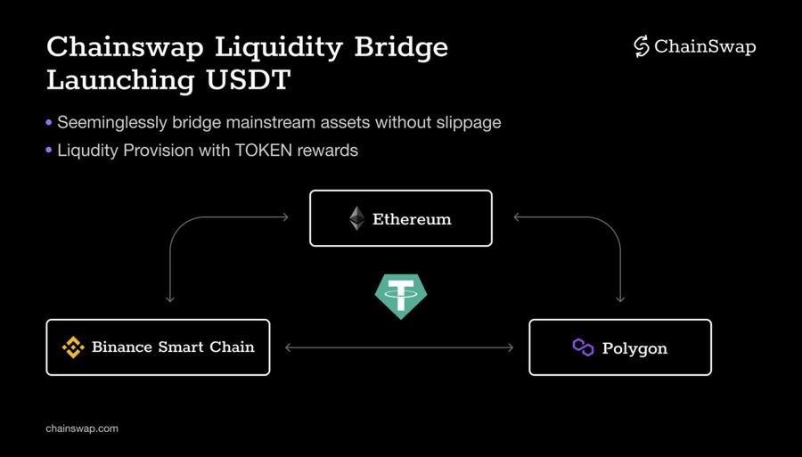 ChainSwap Liquidity Bridge is a dynamic feature that will allow the bridging of mainstream assets (USDT, USDC, DAI..) across all major chains supported by ChainSwap.